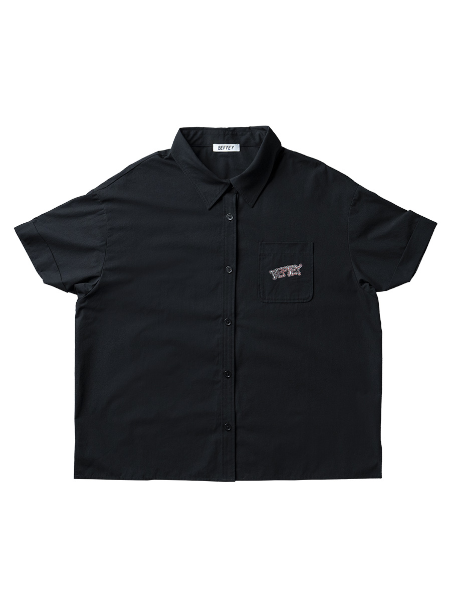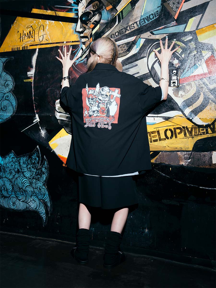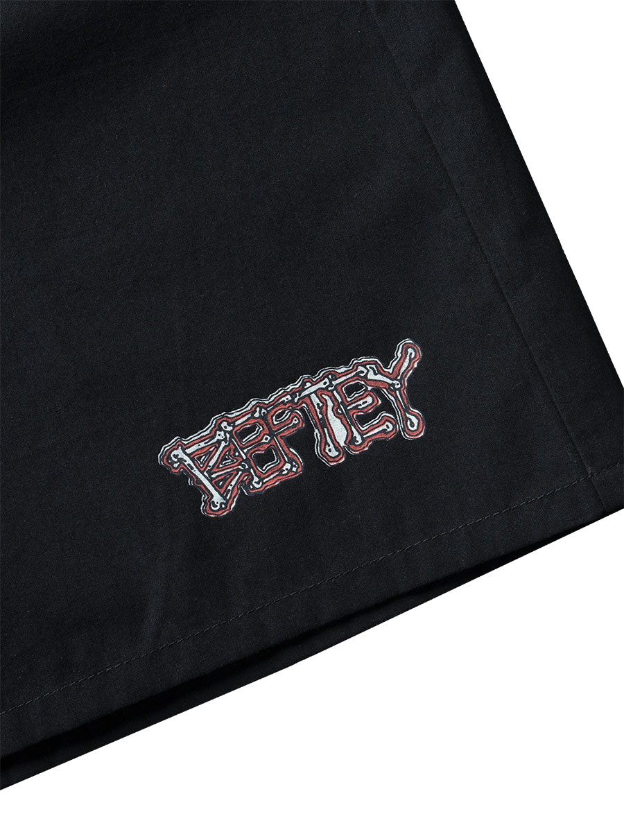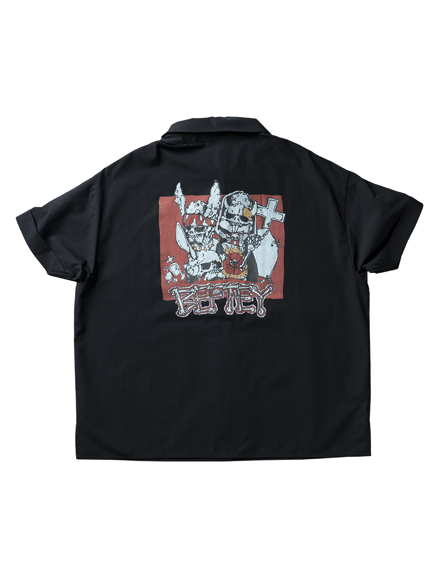 オーバーサイズシャツとハーフパンツのセットアップ。左胸ポケットには骨モチーフBEFTEYロゴプリントが、背面にバンTとお揃いのプリントが入っています。シャツ1枚で他のアイテムとスタイリングしても◎セットアップで着るとよりBEFTEY感を楽しめます。
