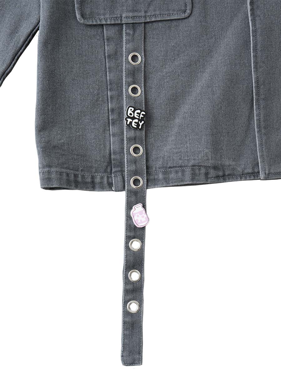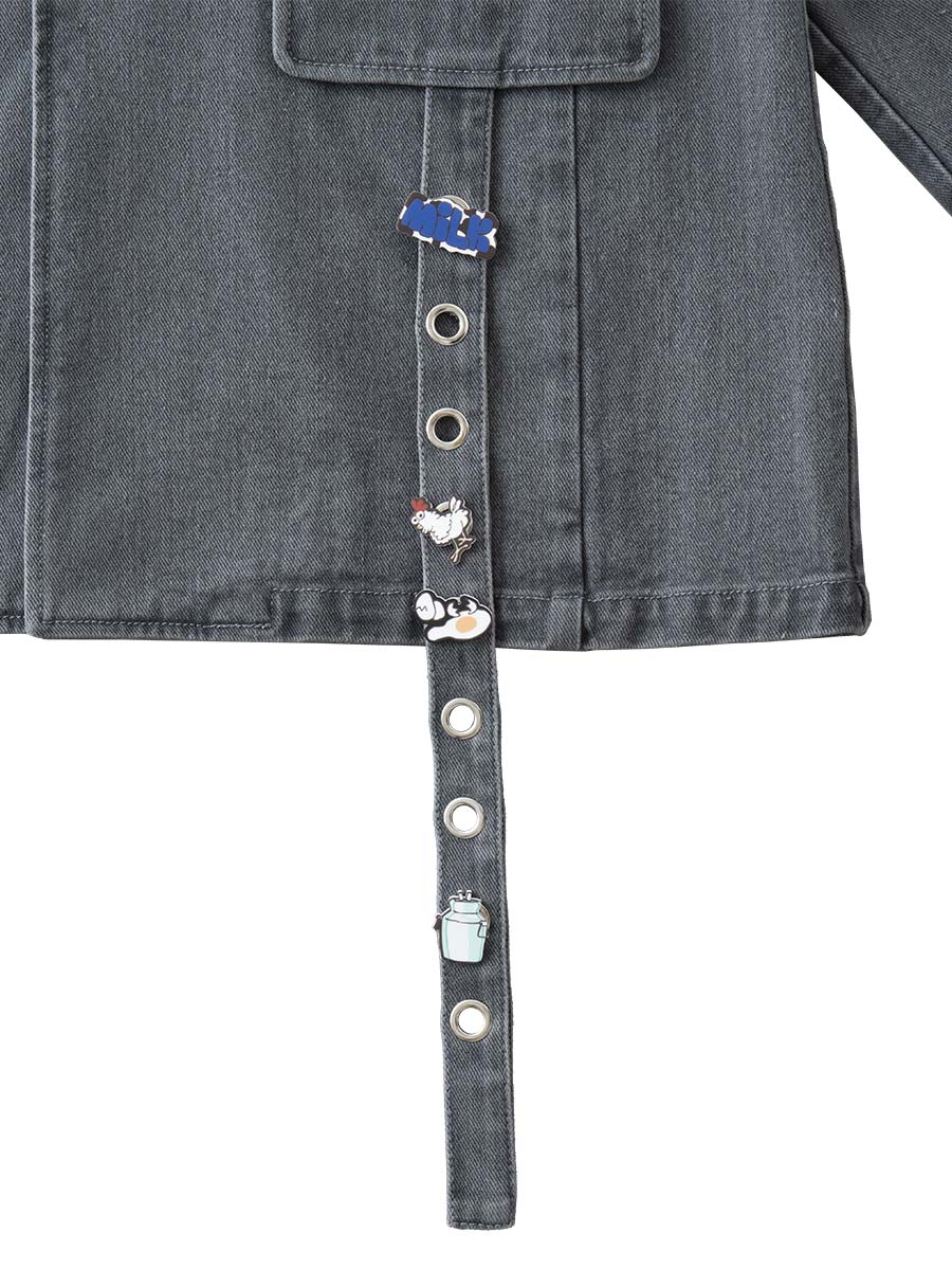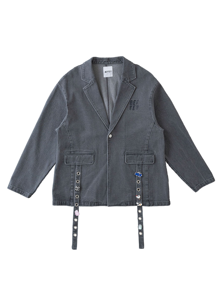 ストラップ付きデザインジャケット。フラップポケットに付けられたストラップにはハトメ穴があいており、付属のバッジはもちろん、お気に入りのチャームやアクセサリーをプラスして自由にアレンジが楽しめます。グレーストライプ・ブラックストライプ・グレーデニムの3色展開。