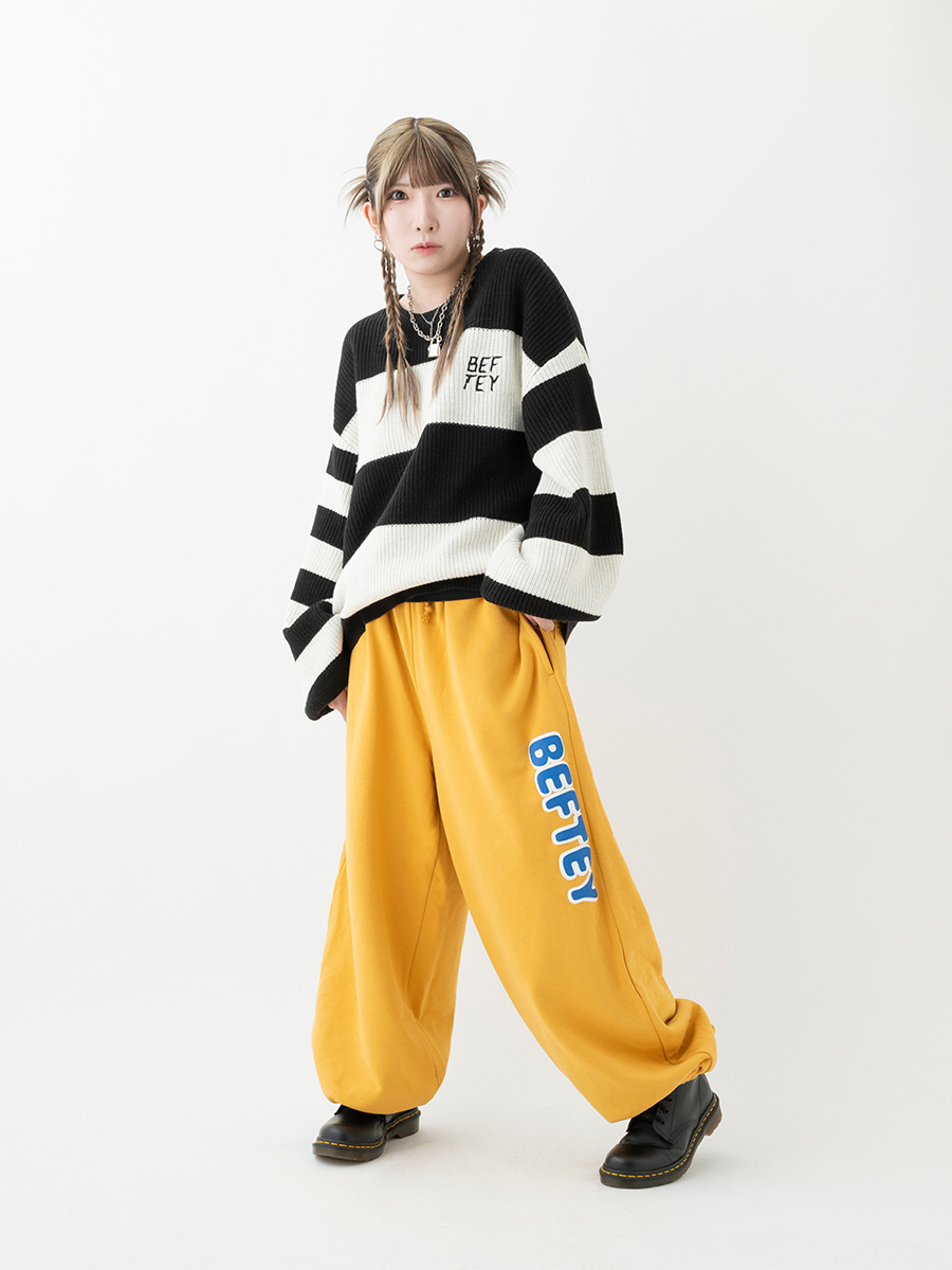立体的なぷっくりBEFTEYロゴが目を惹くカラースウェットパンツ。ウエストはゴム+ドローコード仕様で調整可能です。リラックスした穿き心地ながらストリートスタイルにもぴったりなスウェットパンツです。