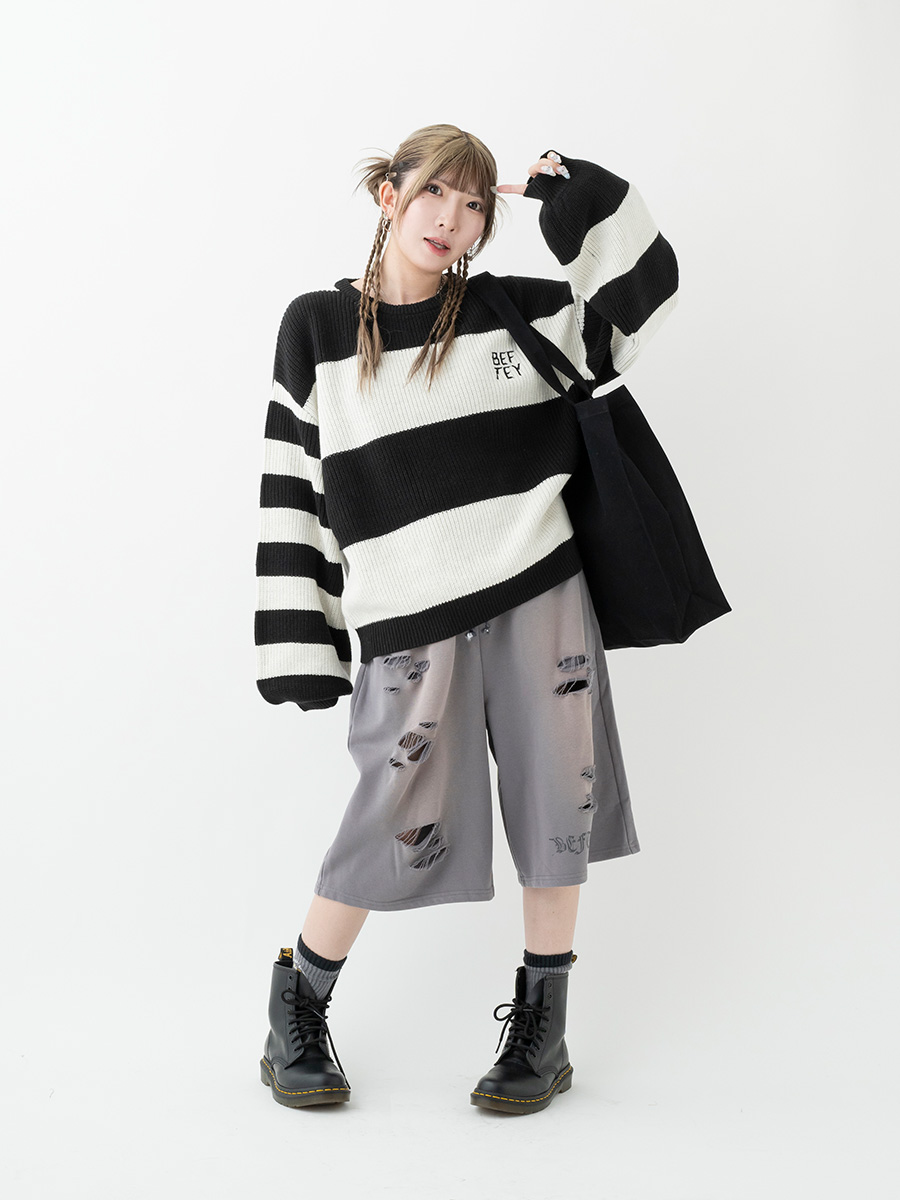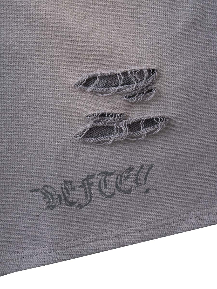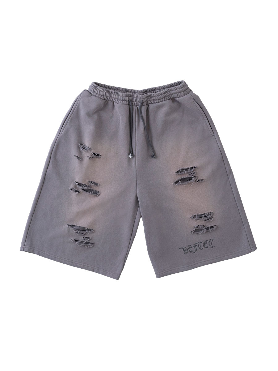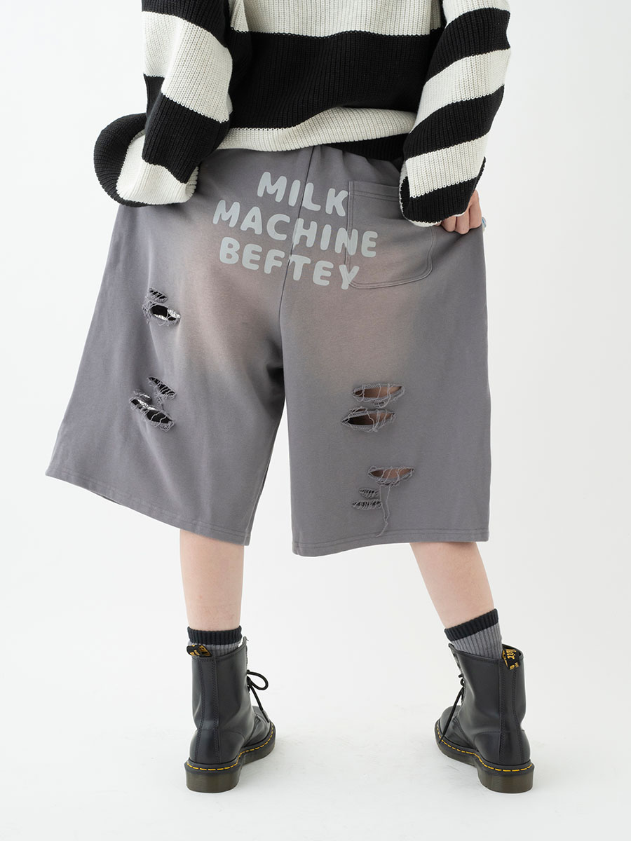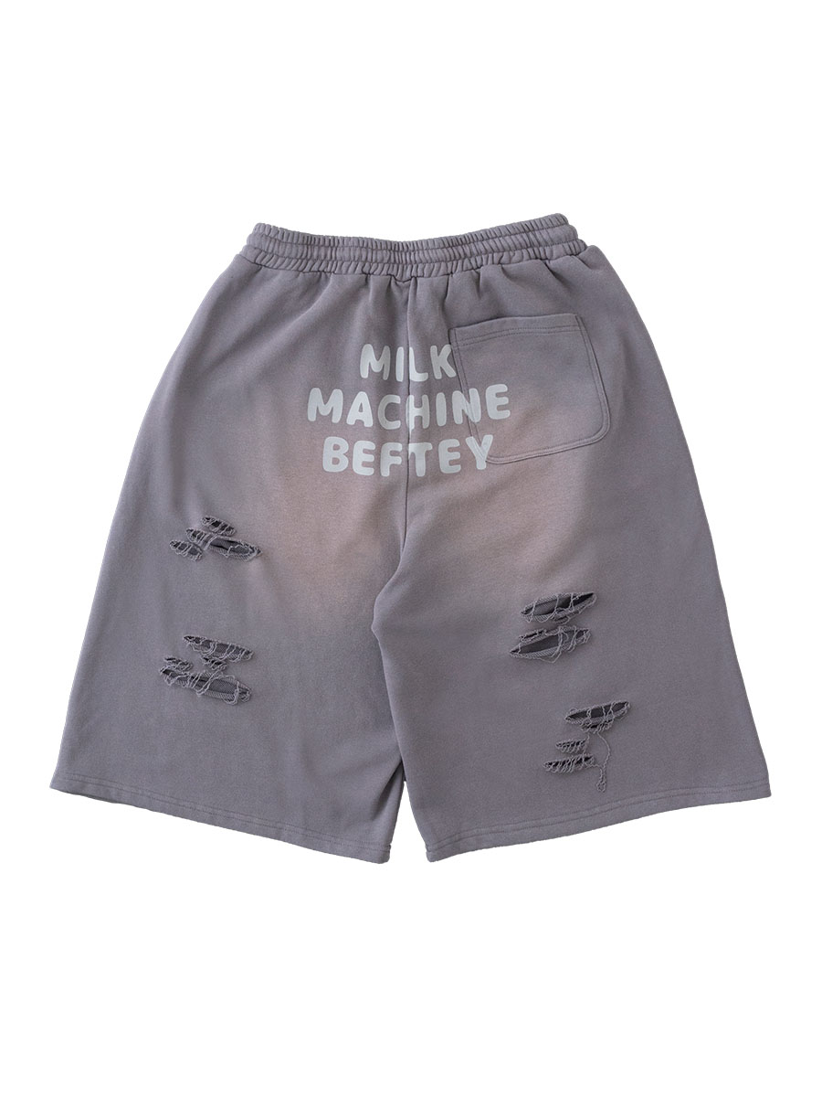 程よい色落ちとダメージ加工が入ったスウェットハーフパンツ。左裾のロゴと、ヒップ部分のバックロゴプリントが程よいアクセントに。ウエストはゴム+ドローコード仕様で調整可能です。ユニセックスに着用でき、ストリートスタイルにもラウンジスタイルにもハマる一本です。