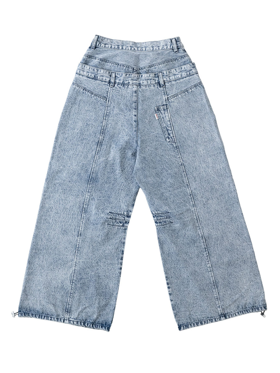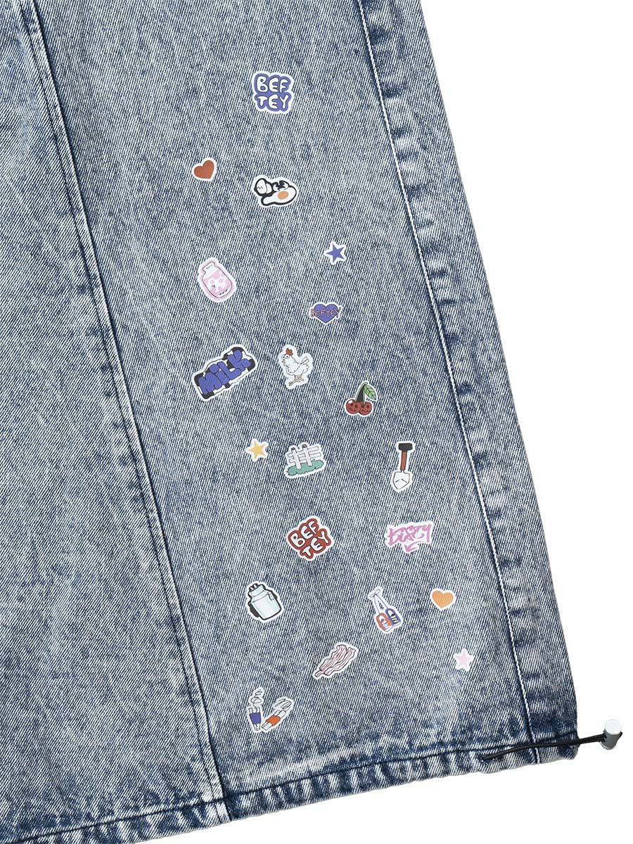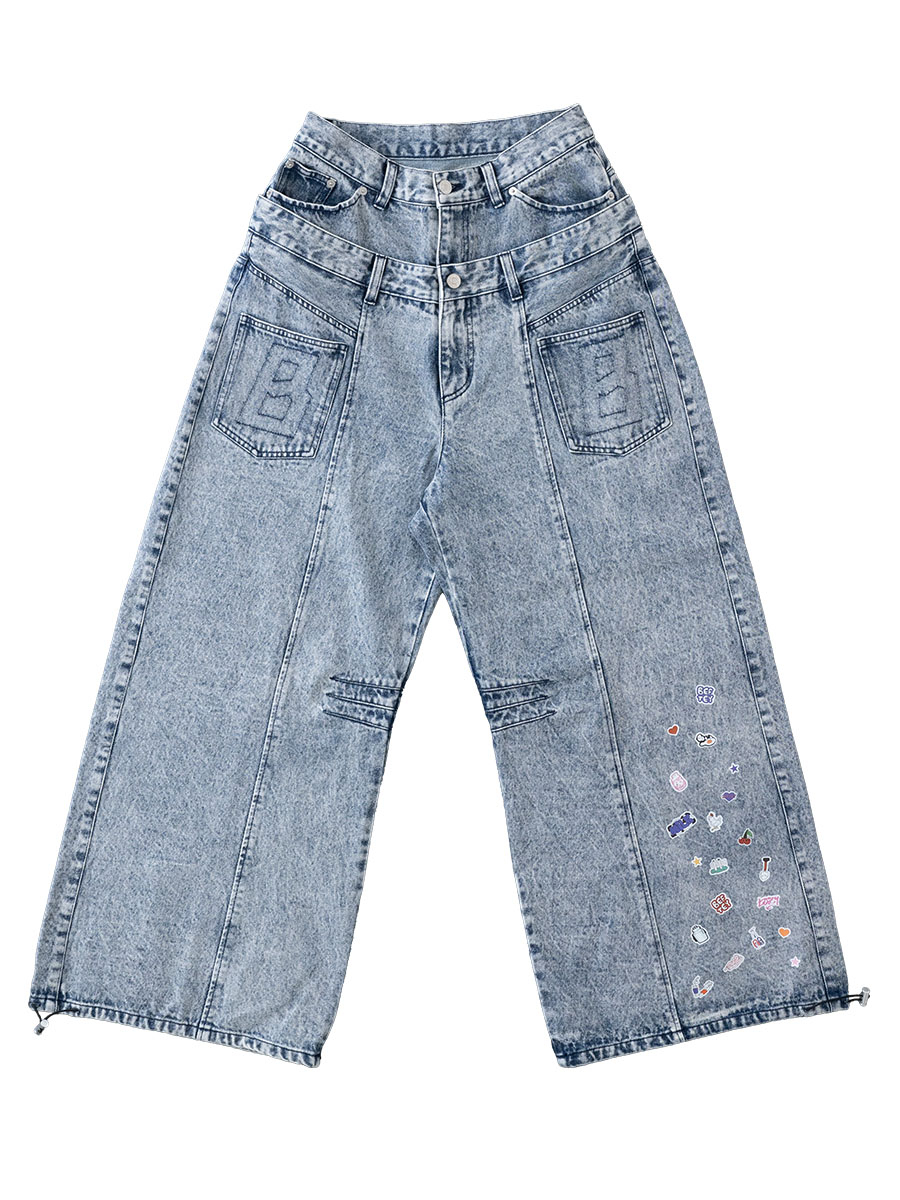 ダブルウエスト切替デニムパンツ。デニムを重ね着したようなウエストデザインで、左足にはステッカー風のイラストがちりばめてあります。ヴィンテージライクなウォッシュ加工とルーズなワイドシルエットで、スニーカーやブーツとも相性◎ブルー、ブラック、グレーの3色展開です。