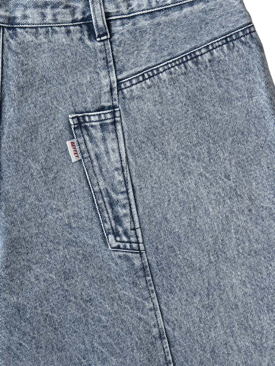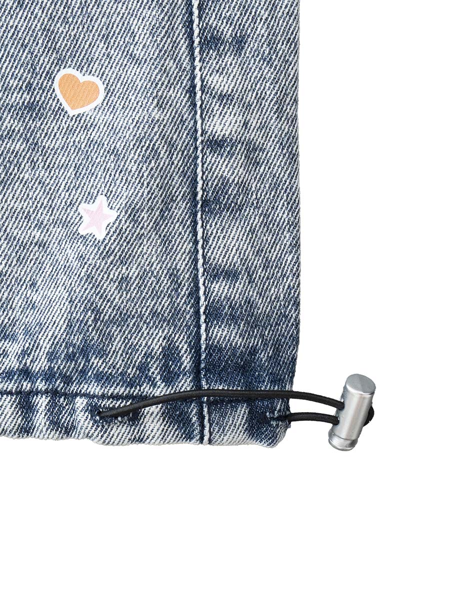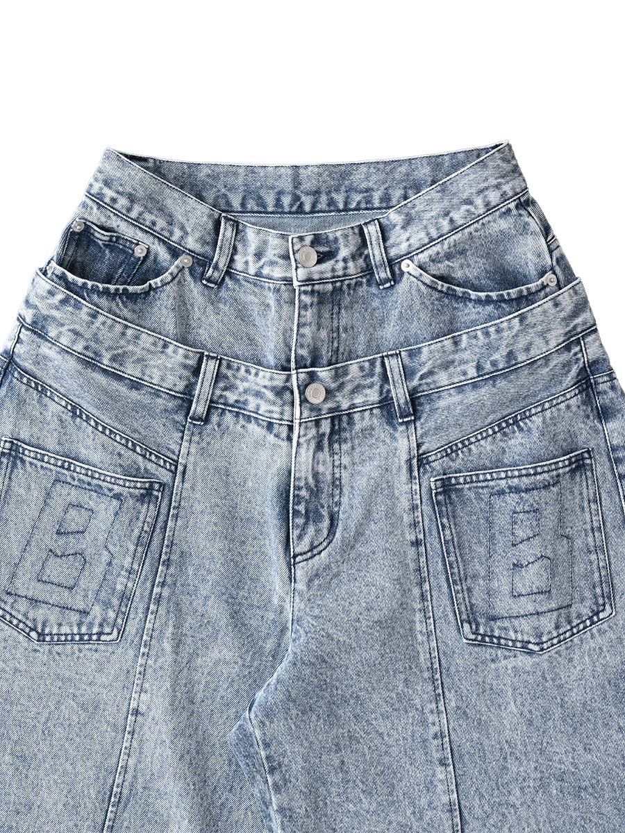 ダブルウエスト切替デニムパンツ。デニムを重ね着したようなウエストデザインで、左足にはステッカー風のイラストがちりばめてあります。ヴィンテージライクなウォッシュ加工とルーズなワイドシルエットで、スニーカーやブーツとも相性◎ブルー、ブラック、グレーの3色展開です。