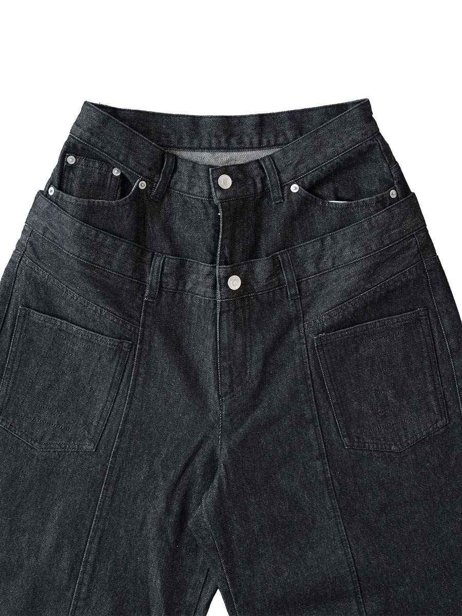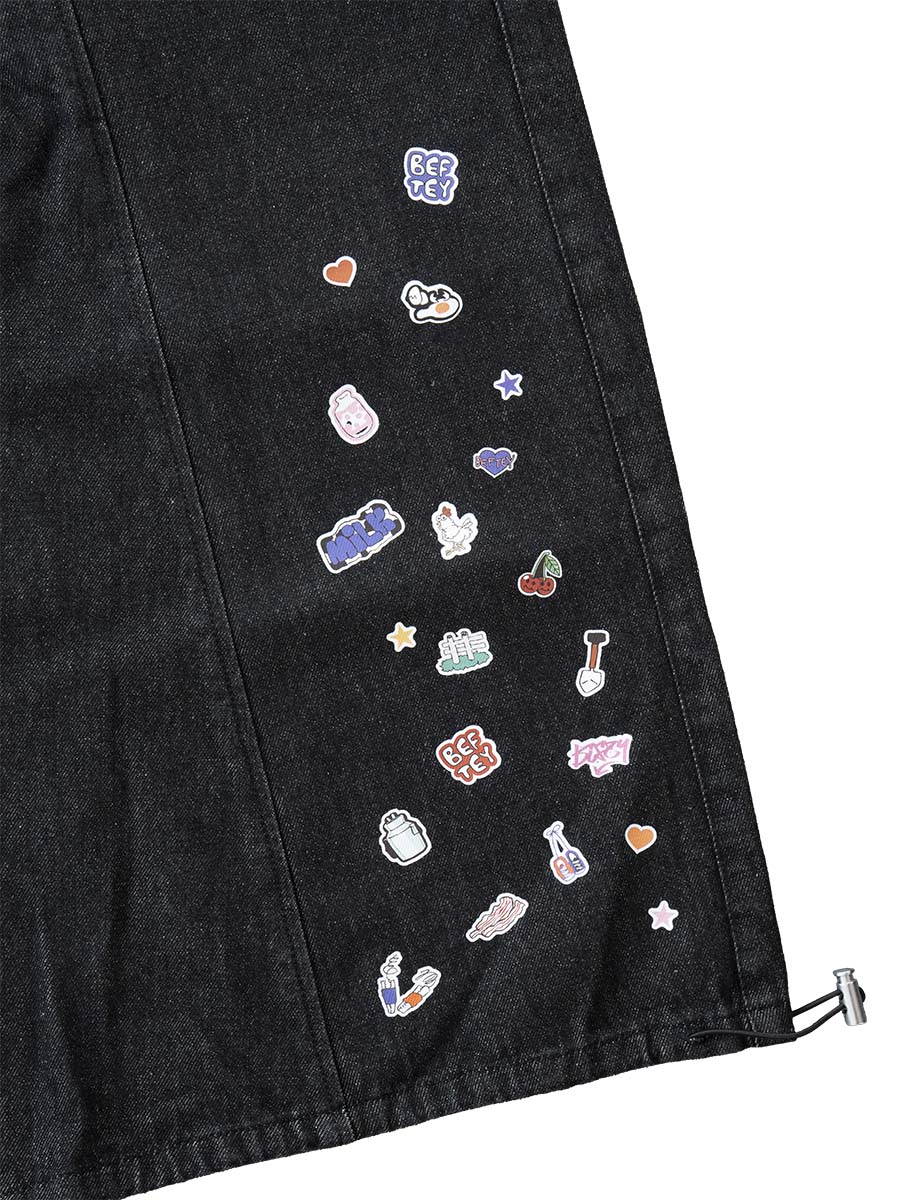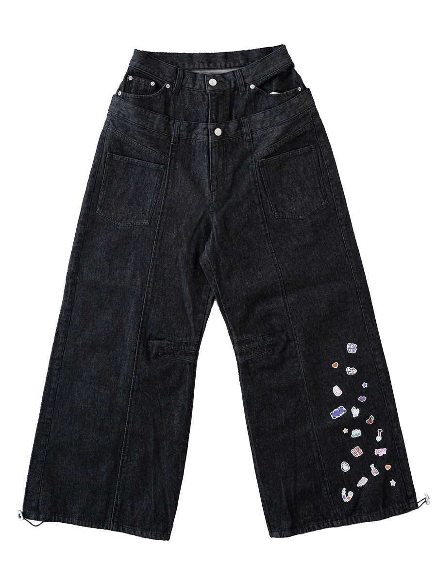 ダブルウエスト切替デニムパンツ。デニムを重ね着したようなウエストデザインで、左足にはステッカー風のイラストがちりばめてあります。ヴィンテージライクなウォッシュ加工とルーズなワイドシルエットで、スニーカーやブーツとも相性◎ブルー、ブラック、グレーの3色展開です。