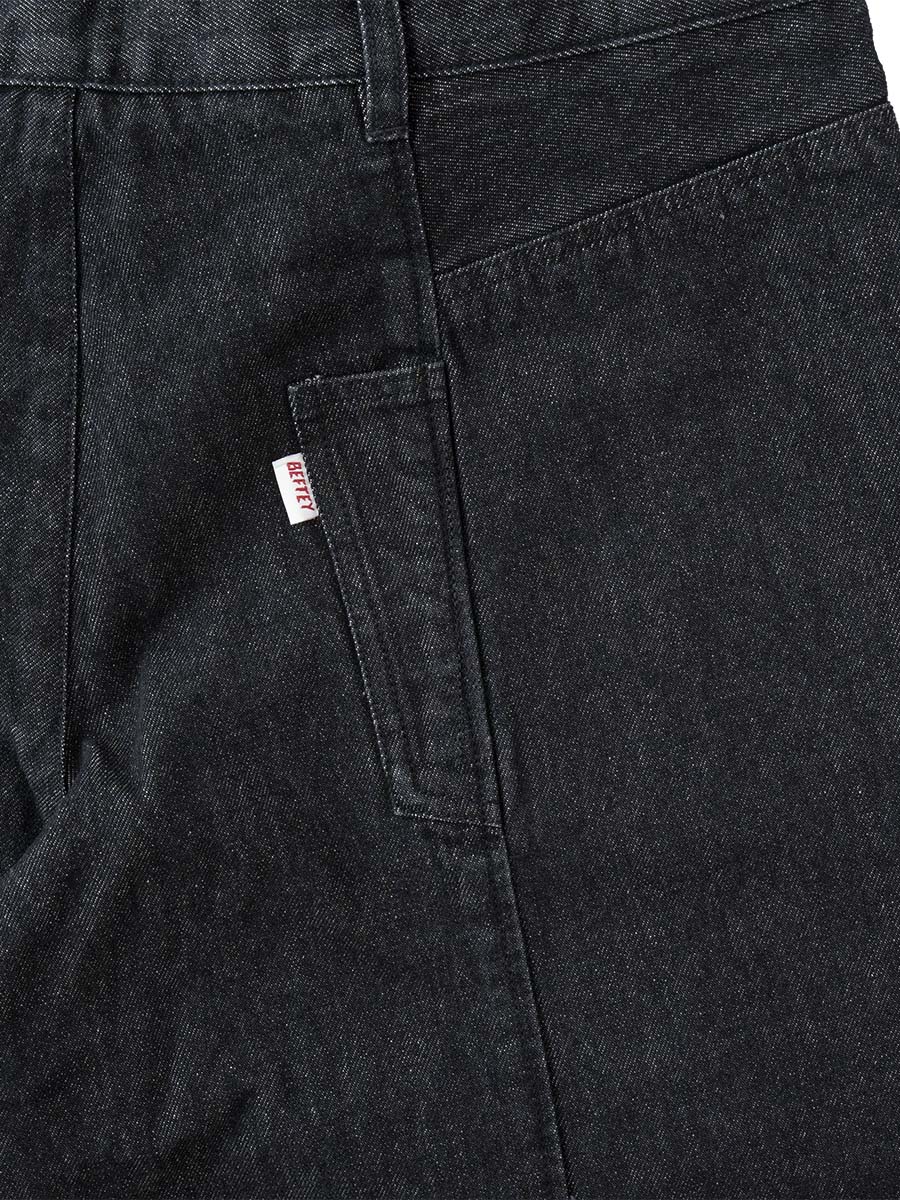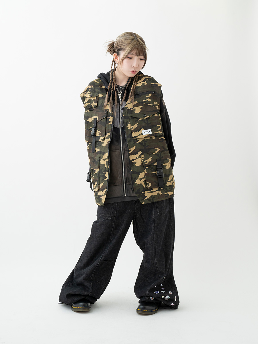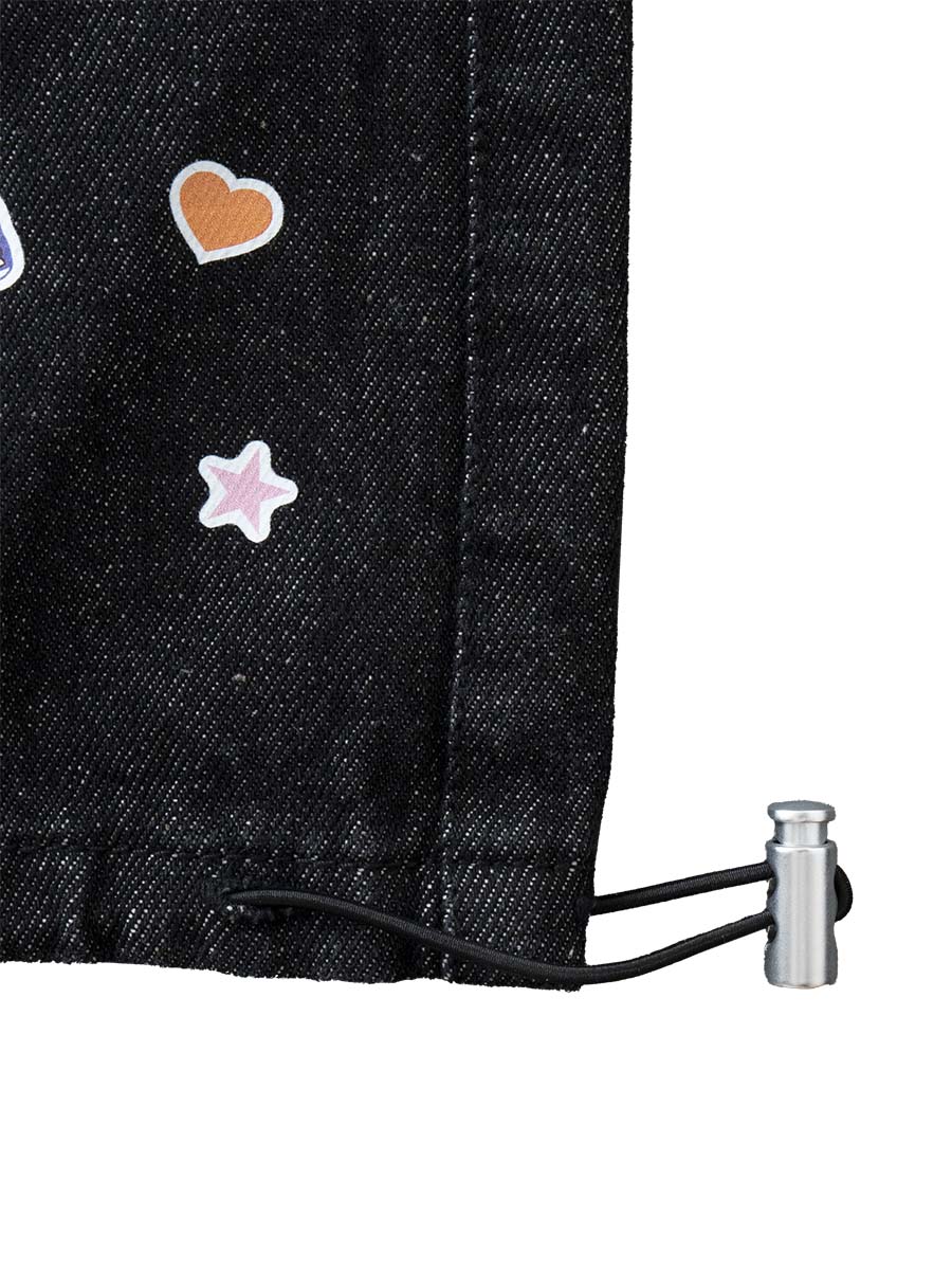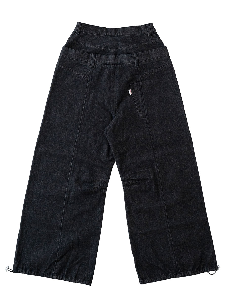 ダブルウエスト切替デニムパンツ。デニムを重ね着したようなウエストデザインで、左足にはステッカー風のイラストがちりばめてあります。ヴィンテージライクなウォッシュ加工とルーズなワイドシルエットで、スニーカーやブーツとも相性◎ブルー、ブラック、グレーの3色展開です。