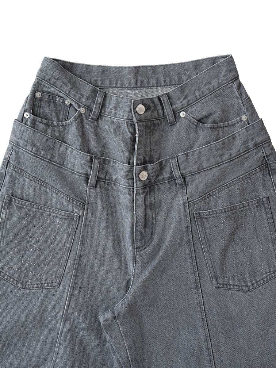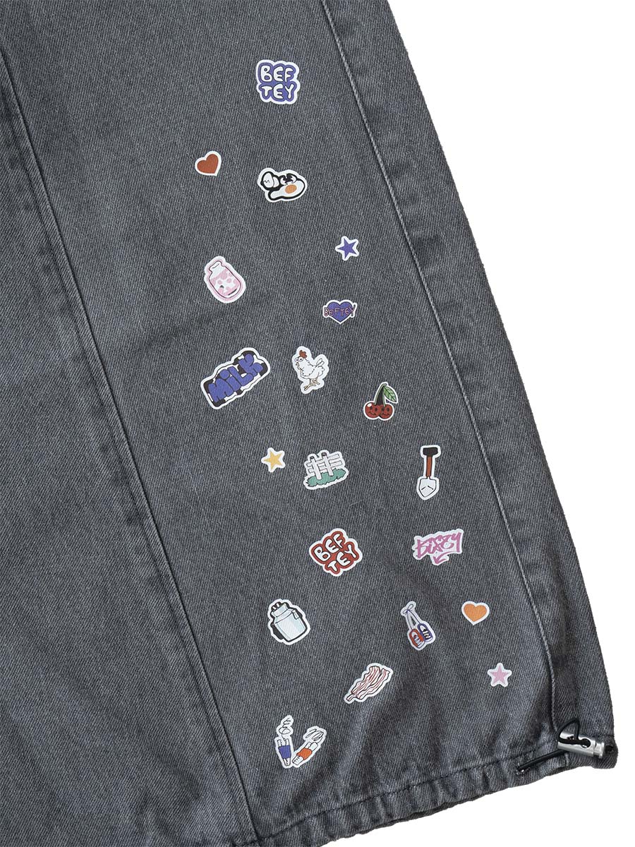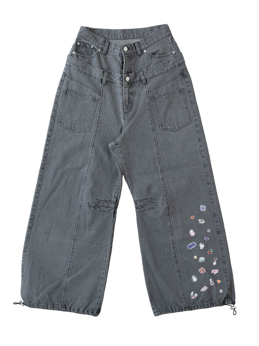 ダブルウエスト切替デニムパンツ。デニムを重ね着したようなウエストデザインで、左足にはステッカー風のイラストがちりばめてあります。ヴィンテージライクなウォッシュ加工とルーズなワイドシルエットで、スニーカーやブーツとも相性◎ブルー、ブラック、グレーの3色展開です。