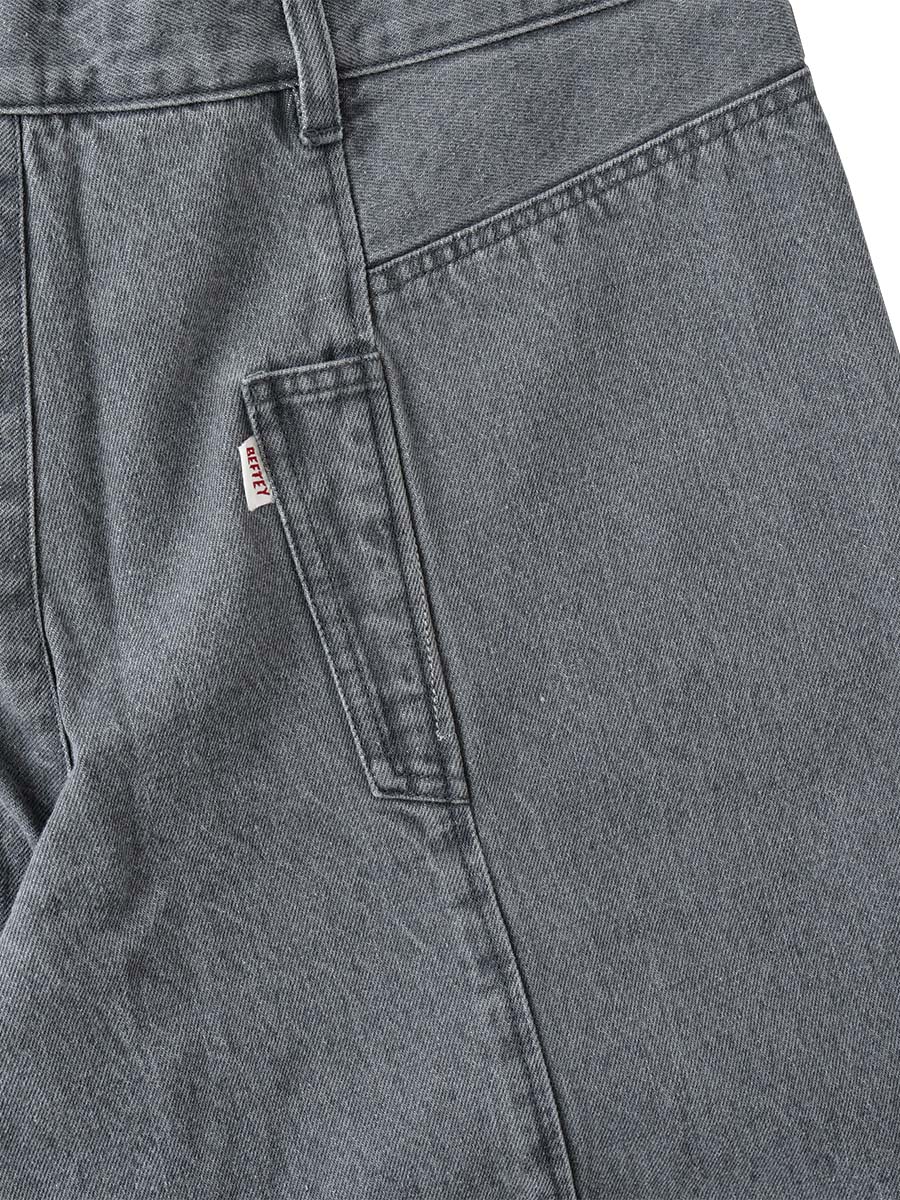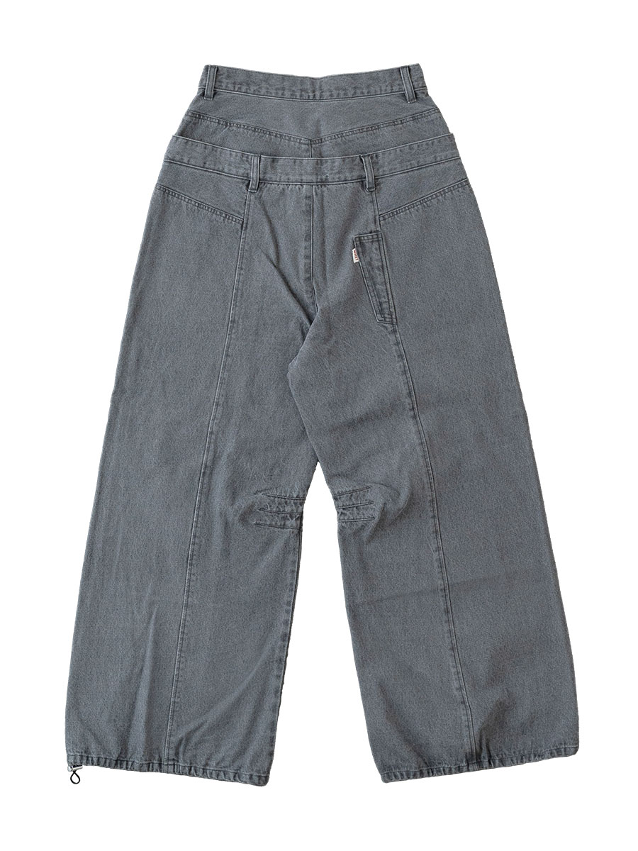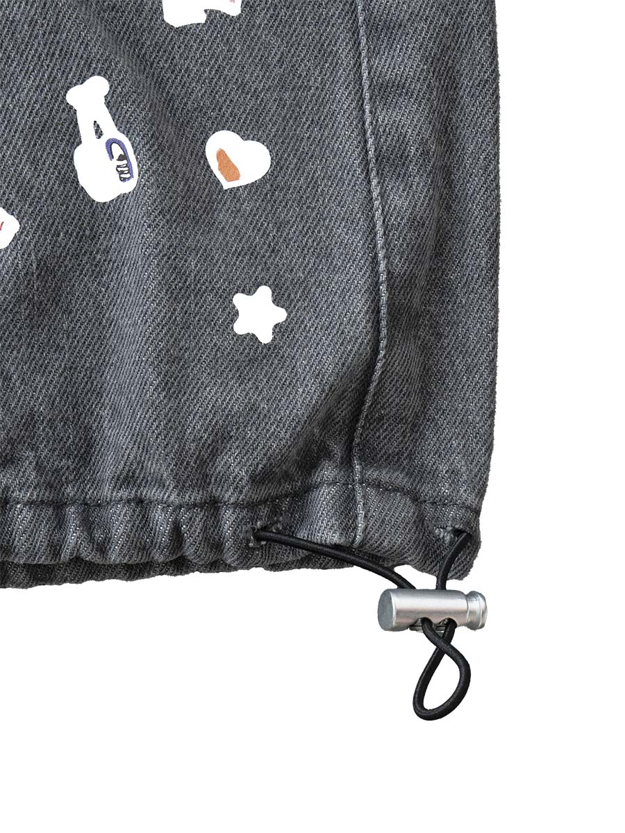 ダブルウエスト切替デニムパンツ。デニムを重ね着したようなウエストデザインで、左足にはステッカー風のイラストがちりばめてあります。ヴィンテージライクなウォッシュ加工とルーズなワイドシルエットで、スニーカーやブーツとも相性◎ブルー、ブラック、グレーの3色展開です。