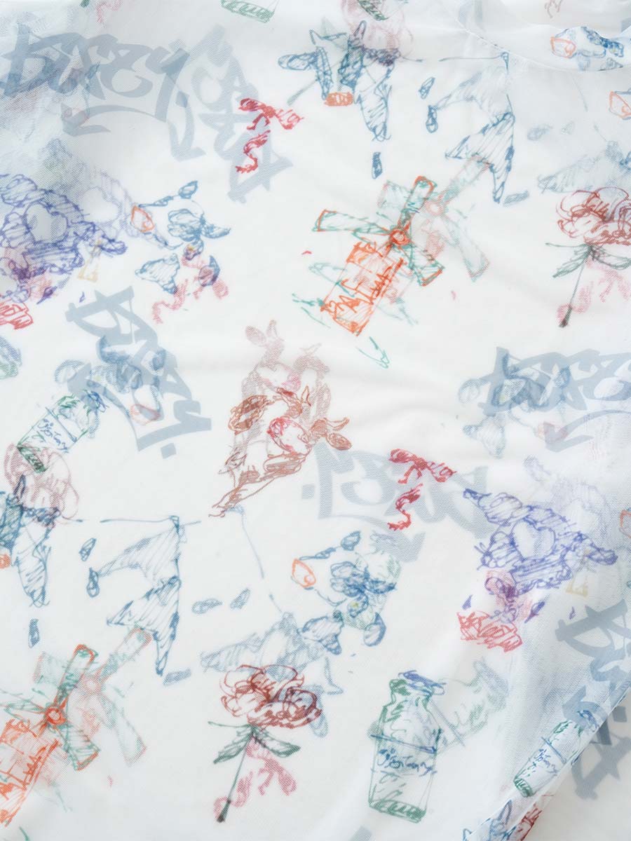 オリジナルプリントのシアートップス。透け感とグラフィックのバランスが絶妙で、Tシャツのインナーとしてもレイヤードの主役としても着こなしを楽しめます。タイトすぎない程よくゆとりのあるシルエットで、肌なじみも快適。迷彩柄は24AWで登場した、よく見たらうしくんが隠れた迷彩柄です。