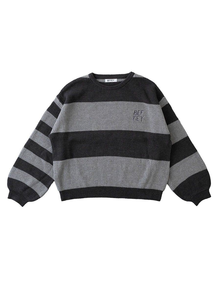 色々ピッチのボーダーニット。身頃と両袖で異なるボーダーピッチを組み合わせた、ちょっぴりひねりの効いた一枚。左胸にはさりげなくロゴ刺繍をプラス。程よくルーズなシルエットで、デニムやパンツ、スカートとの相性も抜群で、いつものコーデに抜け感をプラスしてくれます。