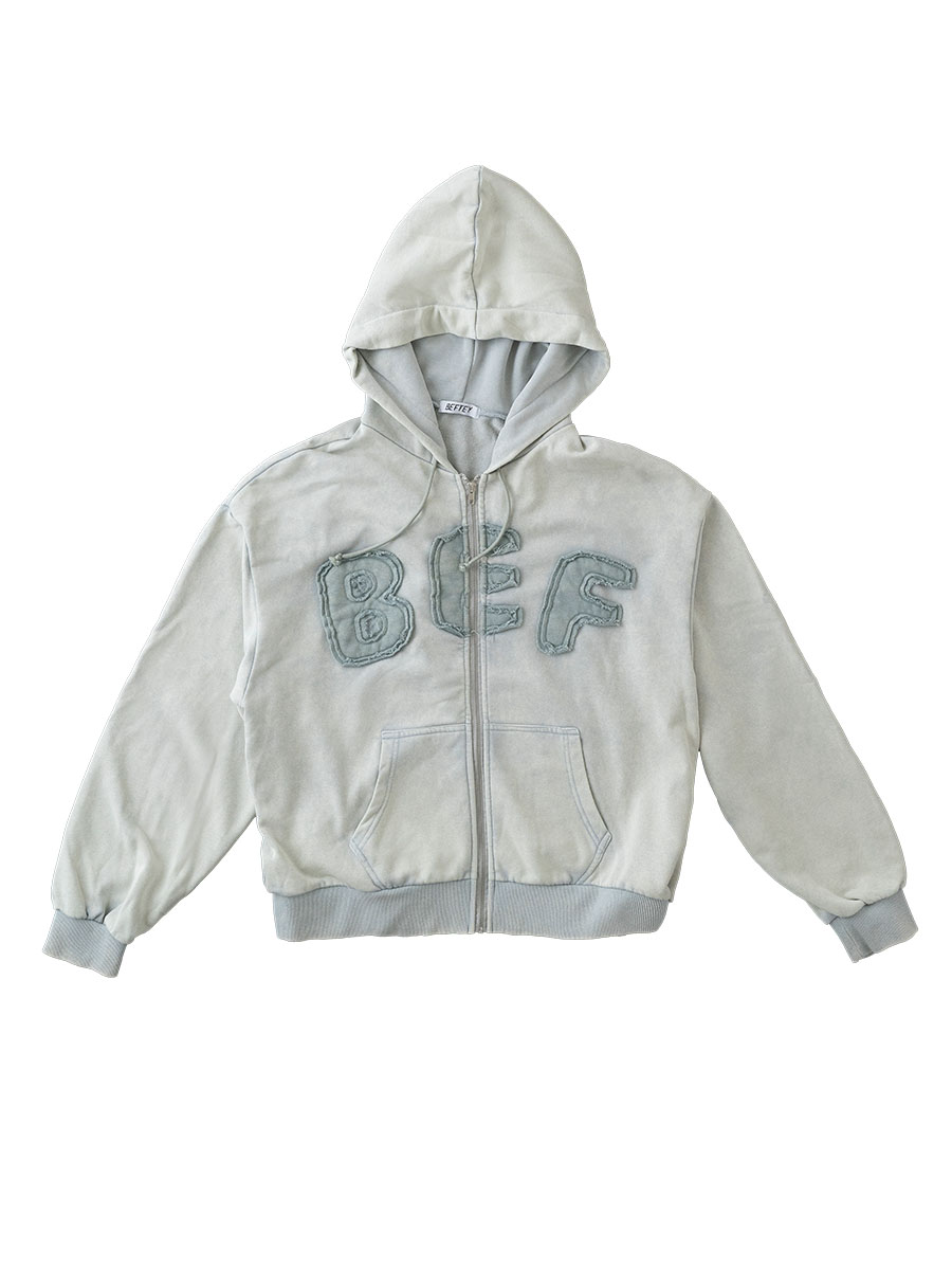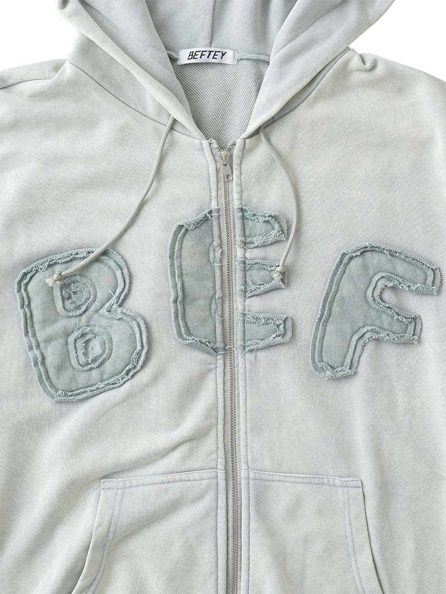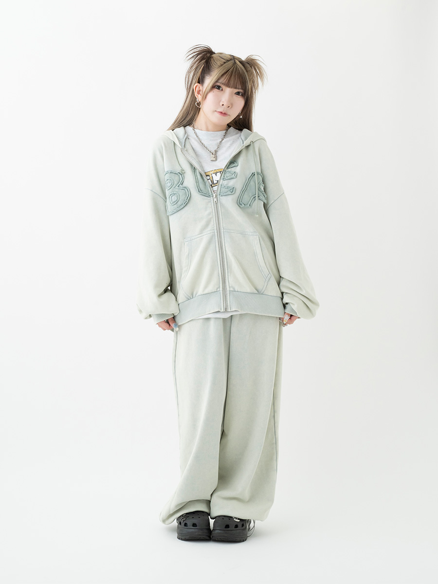 切り抜きロゴが入ったジップアップパーカー。胸元のロゴは、2枚の生地を重ねて大胆にカットオフ。ラフな切りっぱなし仕上げと配色デザインで存在感のあるアクセントに。ほどよくルーズなシルエットで、羽織るだけでコーデを一気にストリートモードに引き上げ、デニムやパンツとの相性も抜群◎同シリーズのスウェットパンツとのセットアップコーデがおすすめです。