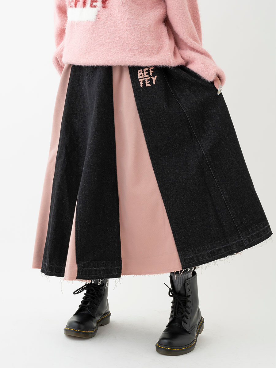 デニムスウェット切り替えロングスカート(ブラック×ピンク)